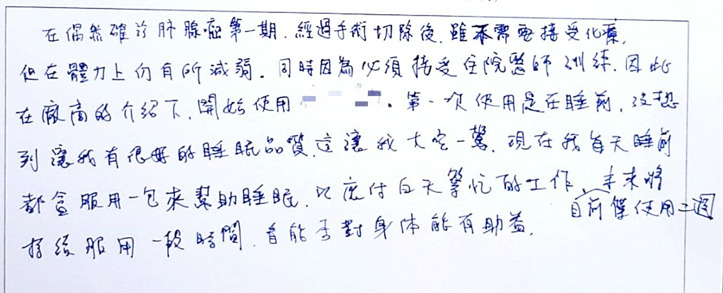 在偶然確診肺腺癌第一期,經過手術切除後,雖不需要接受化療,但在體力上仍有所減弱,同時因為必須接受住院醫師訓練,因此在接觸到介紹後,開始食用精製黃耆多醣。 第一次使用是在睡前,沒想到讓我有很好的睡眠品質,這讓我大吃一驚,現在我每天睡前都會服用一包來幫助睡眠,以應付白天繁忙的工作。目前僅使用二週,未來將持續服用一段時間,看能否對身體有更多的助益。